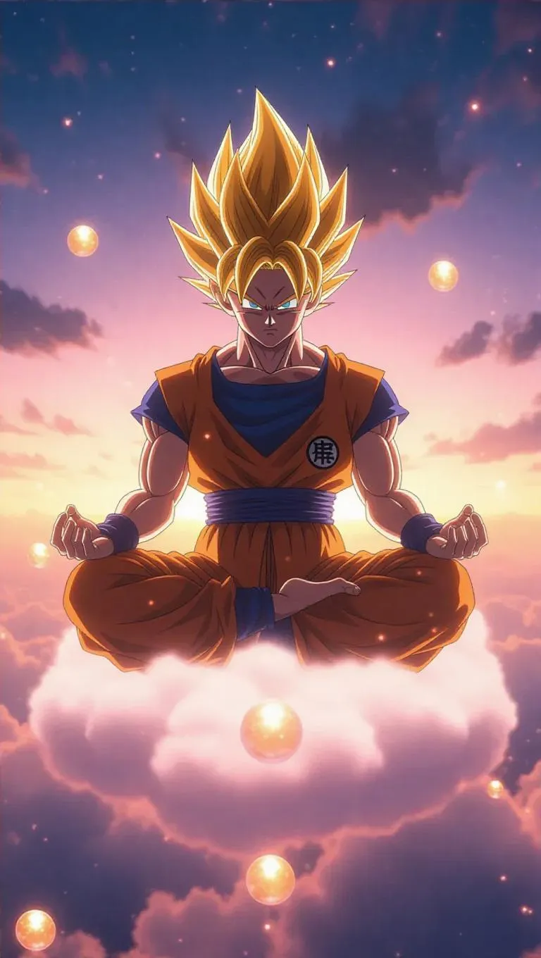 Goku meditates alone on a flying cloud, his hair radiant with golden highlights. His lightweight clothing flutters as luminous Dragon Balls swim around him. Soft ethereal lighting creates a misty glow, surrounded by a pastel sunset, establishing a dreamlike yet uplifting atmosphere.