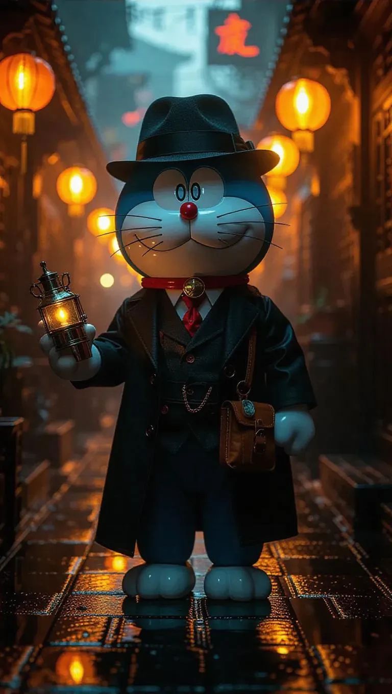 Doraemon, reimagined as a gritty noir detective, stands beneath flickering streetlamps in a fog-heavy alley of 1930s Shanghai. Dressed in a tailor-made suit and fedora, he holds a glowing device. His gadget pouch contains various mysterious, radiant artifacts. The low lighting creates heavy shadows that enhance the atmospheric noir setting. The glow from neon signs adds dramatic flair against the damp cobblestones, thickening the air of suspense. The aura combines Chinese heritage with noir sensibility.