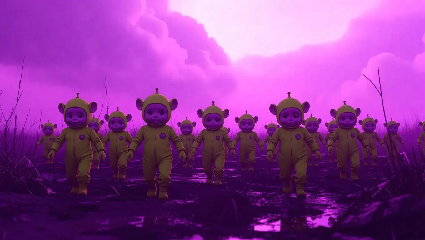 Teletubbies, their bright suits tattered and intertwined with wires, traverse as mystical figures through a toxic wasteland. Their expressions are peaceful yet pained, eyes capturing the harshness surrounding them. The sky is a sickly purple, burdened with looming storm clouds, casting an unsettling glow over the barren terrain. Soft, translucent light filters through the clouds, creating an eerie, dreamlike atmosphere. The scene is post-apocalyptic, illustrating the stark change from their joyful beginnings to their current grim reality.