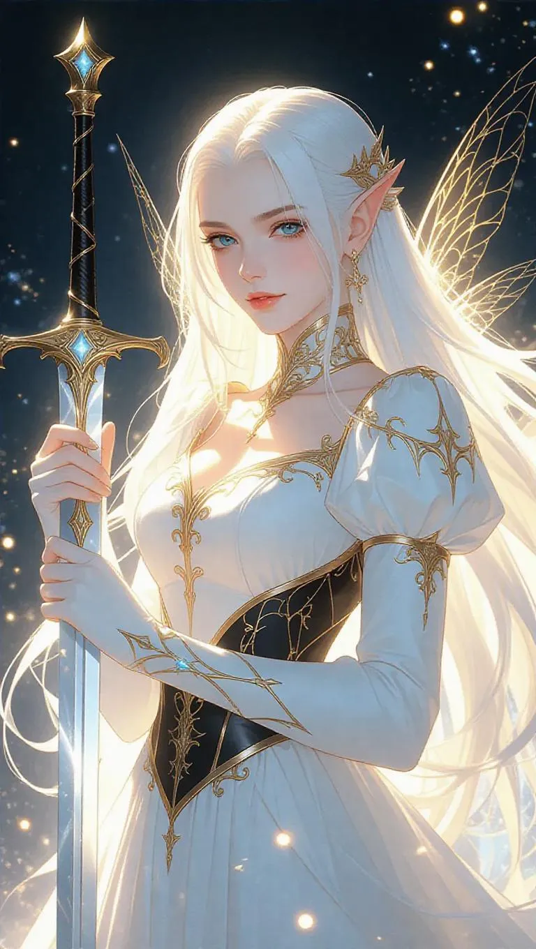 Snow White, illustrated in an ethereal fantasy style, grasps a magical sword, her composed gaze determined to vanquish a dark king. Her long white hair shimmers against her radiant skin, and she wears an elegant, flowing gown. Mythical dwarves with shimmering wings hover nearby, ready to assist. The background is a celestial clearing, with twinkling stars framing the horizon. Glowing orbs float in the air, casting soft light. Radiant, celestial light envelops Snow White, while shadowy elements in the distance enhance the sense of wonder. The theme blends ethereal beauty with traditional fairy tale elements.