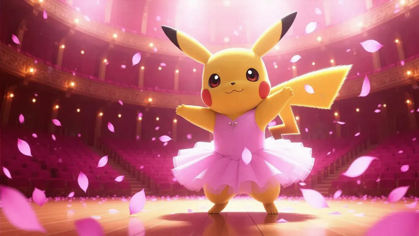 Pikachu, donning a graceful ballerina outfit, stands tall in a grand theater. Its cheeks flicker with electricity, and its focused eyes reflect the elegant, dramatic atmosphere. Floating petals swirl around it, adding a romantic yet intense ambiance. The stage is bathed in soft spotlight, creating a theatrical glow that enhances the scene's elegance. The style is a blend of realism and anime, capturing Pikachu's poised stance and the beautiful artistry of the environment.