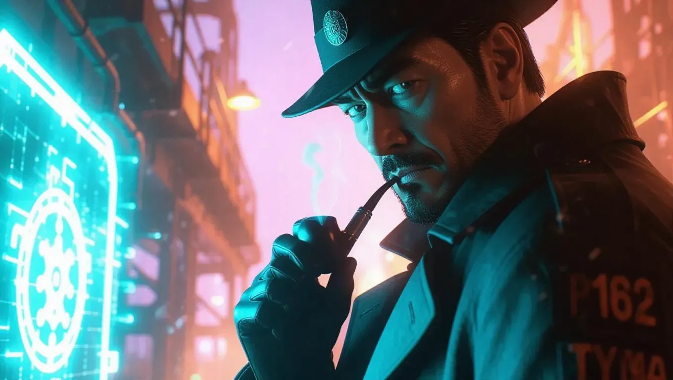 A rugged adult Detective Conan, with stubble and a pipe, investigates a smuggling operation in a remote, neon-lit dockyard. High-tech clues float on holograms, casting an ominous glow. The dockyard's rugged, industrial setup contrasts with Conan's worn, determined expression. Soft, cool turquoise and silver lights highlight the technology, while hard, warm shadows emphasize his intense focus and the danger of the scene. The style is a blend of noir and maritime adventure, capturing both the gritty realism and the nautical themes.