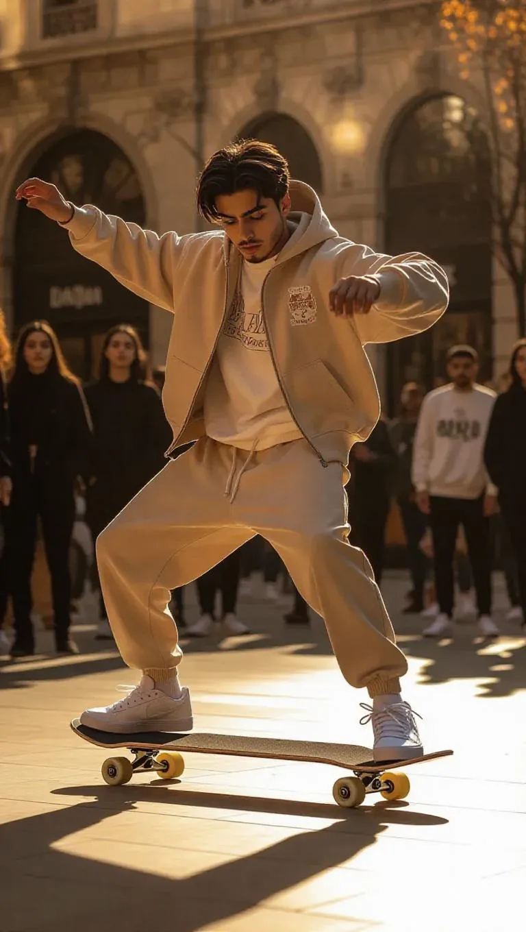 Aladdin, wearing a dapper tracksuit and sneakers, demonstrates impressive skateboard tricks in a chic urban plaza. His smooth movements and confident expressions impress a gathering of fashion-forward onlookers. The plaza features modern architecture and stylish stores, establishing a sophisticated backdrop. Soft, golden sunlight filters through, casting warm, diffused light that highlights the dynamic action and the buzz of city life.