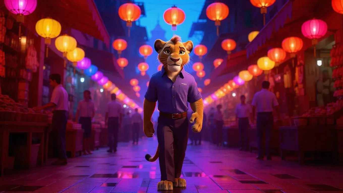 Simba, the lion detective, strolls through a bustling city bazaar filled with vibrant colors and sounds. He sports a simple button-up shirt tucked into his trousers, blending into the crowd. His sharp eyes survey each stall, keen to uncover illicit deals. Bright lanterns overhead cast a warm, inviting glow, while deep shadows lurk in corners, generating an atmosphere of intrigue. The busy scene reflects a cheerful yet suspenseful film noir twist, intertwining community noise with shadowy secrets.