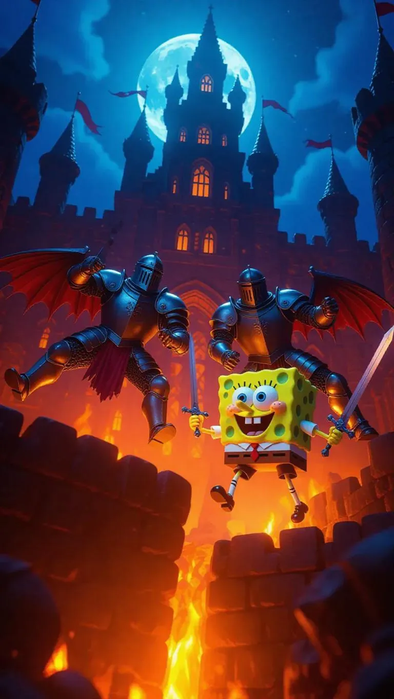 SpongeBob and Larry, armored knights on fiery phoenixes, clash in an epic medieval anime battle. They charge across a lava moat, their weapons gleaming under the full moon. The crumbling castle looms behind them, banners fluttering in the wind. Side lighting casts dramatic shadows, enhancing the intensity of the scene. The style is vibrant and dynamic, blending fantasy with the quirky humor of the characters.