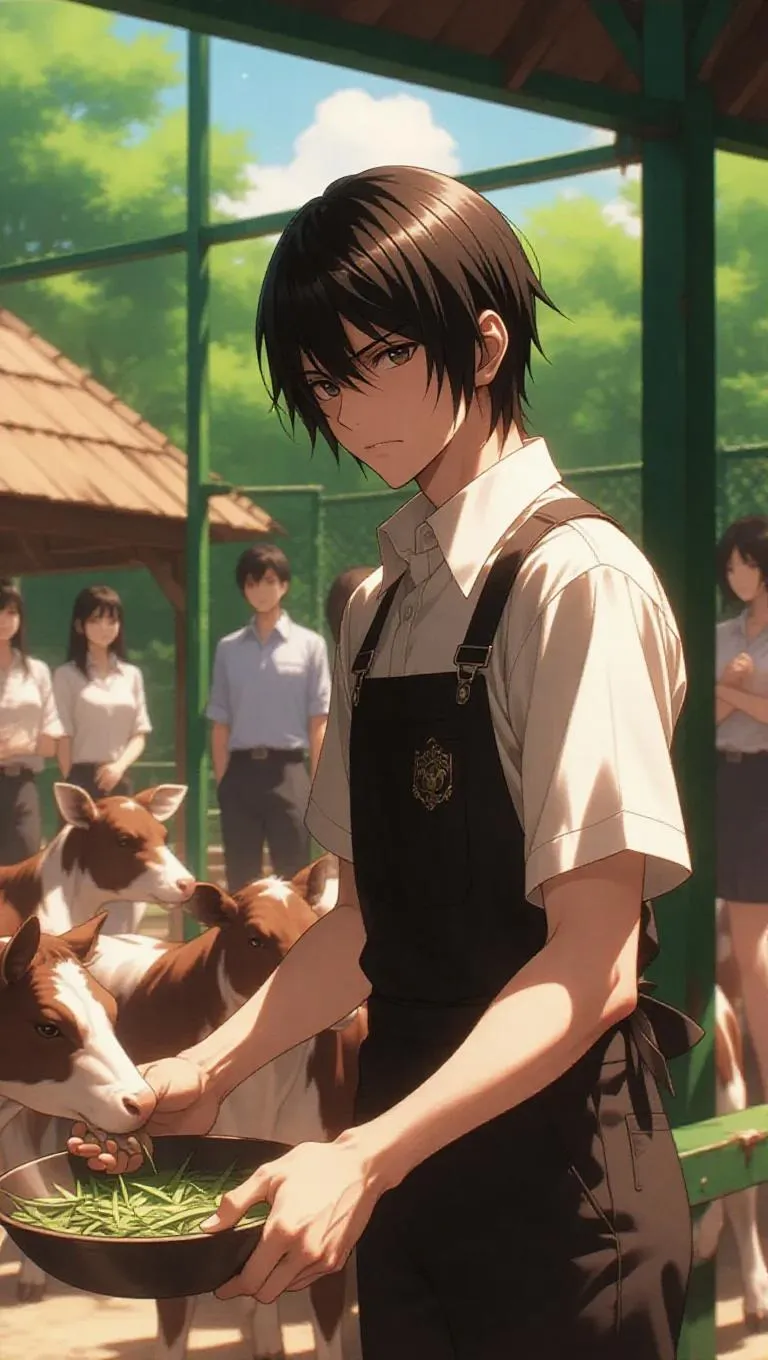 Light Yagami, dressed as a zoo keeper, stands in an animal enclosure, feeding animals with a tired expression. His sharp features are slightly dulled by the monotony of the task. The Death Note is discreetly tucked in a nearby shed, adding a dark contrast to the lively, vibrant surroundings. Visitors watch eagerly, and he interacts with the animals with a strained smile, his eyes betraying his inner turmoil. Bright sunlight casts a joyful tone, enhancing the cheerful atmosphere. The style is realistic, with a touch of psychological tension.