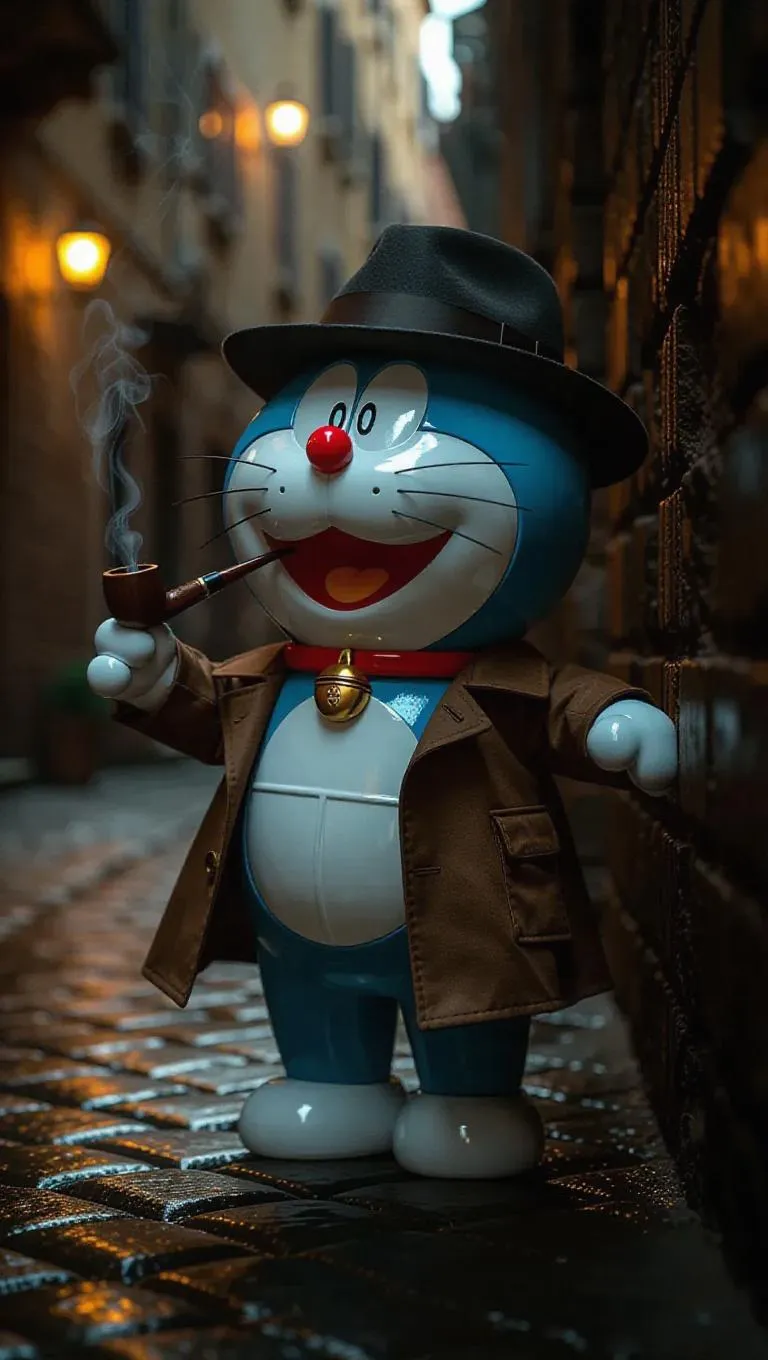 Doraemon, reimagined as a noir detective, paces in an eerie alleyway of 1950s Rome. Clad in a stylish trench coat and a fedora, he leans against a crumbling wall, a pipe in hand. His gadget pouch contains intriguing, luminescent devices. The dark, atmospheric lighting casts pronounced shadows, enhancing the film noir aesthetic. The distant flickering of candles provides a soft glow amidst the harshness, strengthening the air of suspense. The scene combines Italian retro charm with classic noir themes.