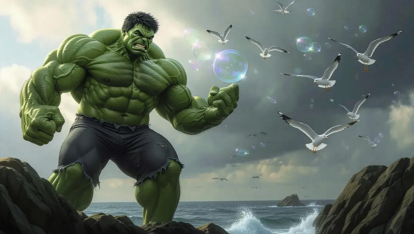 Hulk, a towering green giant with an amused expression, stands on a rocky cliff, blowing bubbles. His muscles are relaxed, and his eyes convey a sense of fun. Seagulls cry above, adding an invigorating touch to the scene. The sky above is stormy gray with occasional rays of sunlight breaking through. The dramatic light accentuates Hulk's green skin and the rugged landscape. The style is realistic, touched by whimsical fantasy.