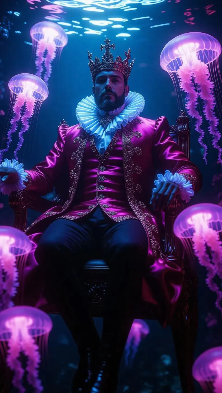 A baroque oil painting in 8K resolution captures the Jellyfish King as a majestic ruler, dressed in royal 18th-century attire. He floats gracefully among luminous jellyfish, his expression regal and dignified. The underwater setting is aglow with phosphorescent light, creating a magical and otherworldly atmosphere. The scene is rendered in a rich, detailed baroque style, emphasizing the contrast between the Jellyfish King's nobility and the vibrant marine life surrounding him.