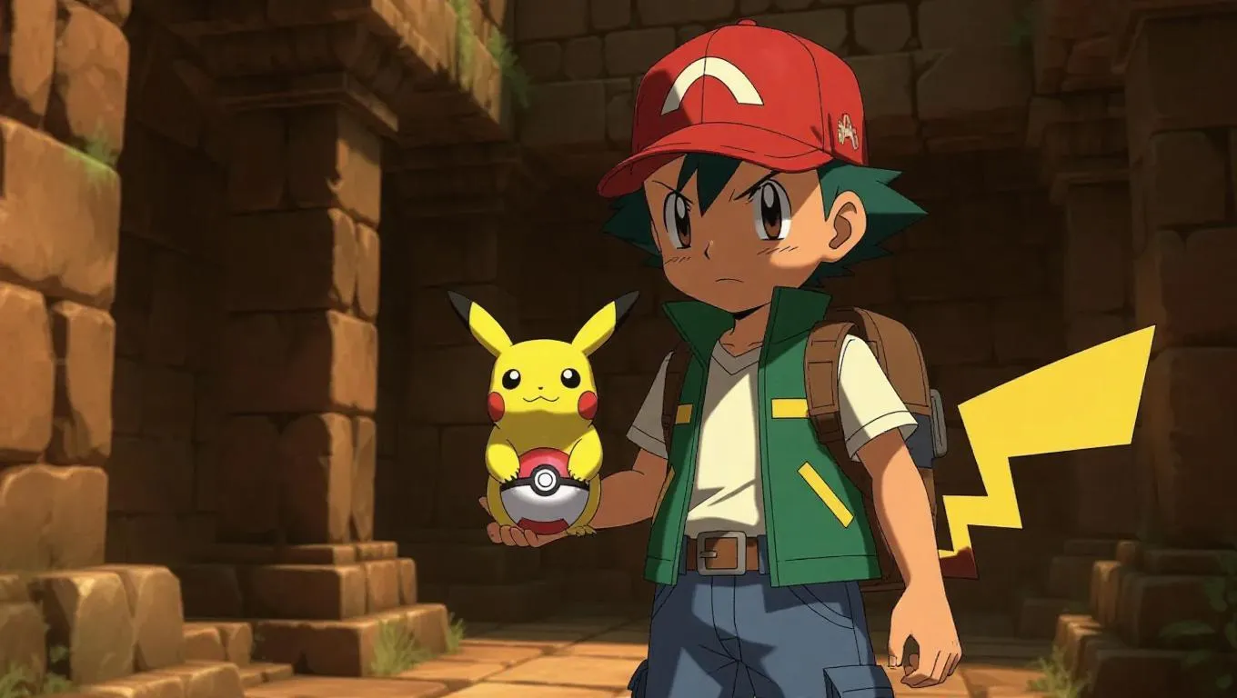 Ash Ketchum, an aged Pokémon trainer, navigates through an ancient ruin, his weathered cap and adorned Pokéball belt revealing his adventures. A historic Pikachu artifact sits clutched in his hand, its significance marking his journey. The ruins are shadowy and crumbling, with muted earth tones revealing stories of the past, creating a mysterious and reverent atmosphere. The scene is rendered in an archaeological style, highlighting the deep history of the environment.