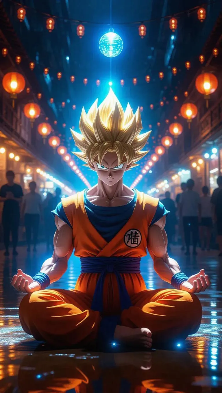 Goku meditates alone inside a bustling marketplace, his hair shimmering bronze. His casual attire flows with the crowd as radiant Dragon Balls zigzag around him. Bright market lights create a vibrant ambiance, filled with chatter and laughter, generating a chaotic yet joyful atmosphere.