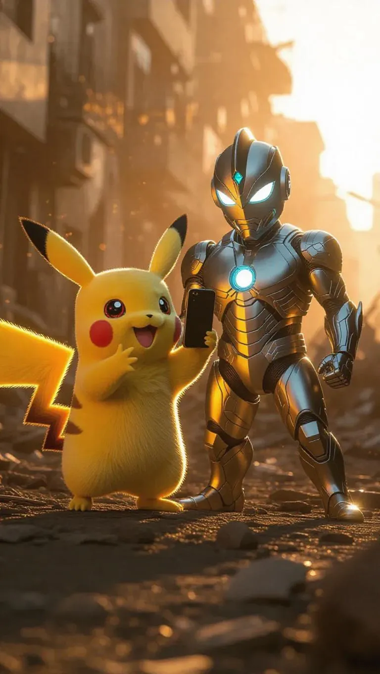 In a photorealistic 8K quality scene, Pikachu and Ultraman stand side by side, grinning as they take a selfie with their smartphones. Ultraman’s back glows with a pale silver aura, while Pikachu is surrounded by sparkling stars. The comical juxtaposition is set against a backdrop of a dusty gray, devastated city, remnants of Ultraman’s battles. Soft, warm light from the setting sun casts long shadows, adding a surreal, almost whimsical touch to the urban ruin.