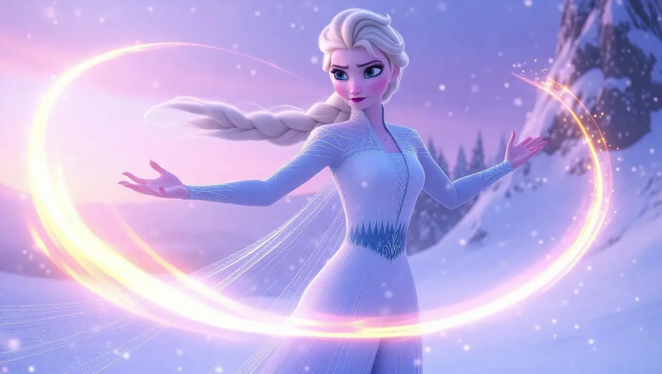Elsa, with her icy blue hair now shimmering with bright yellow streaks, stands confidently in a snowy landscape. She wears a flowing, white gown with delicate silver detailing, her arms outstretched as she casts swirling flames. Glowing embers and frost crystals surround her, adding to the ethereal, mystical atmosphere. The sky is a soft lavender, with drifting snowflakes. Front light highlights her serene expression, while side light emphasizes the enchanting glow of the flames. The style is a mix of surrealism and fantasy elements, capturing the grace and power of an ice mage.