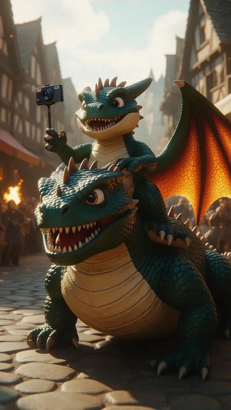 A photorealistic 8K quality scene captures a dragon plushie riding on the shell of the monstrous Gamera, who is breathing fiery flames. The plushie, with a delighted expression, takes a selfie with a bright camera. The background shows a medieval village in disarray, with markets on fire and villagers panicking. Soft, warm light casts dramatic shadows, enhancing the comical yet chaotic atmosphere. The style is hyper-realistic, blending humor with destruction.