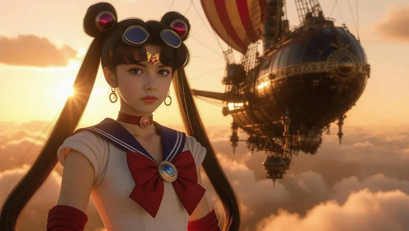 Sailor Moon, dressed in an elaborate steampunk outfit with gears and goggles, stands beside a whimsical airship as it hovers in a cloudy sky. The warm glow of the setting sun behind her casts dramatic shadows on the ship and landscape below. The intricate details of her outfit and the ship evoke a sense of adventure and innovation. Style: Realistic with a touch of manga influence.