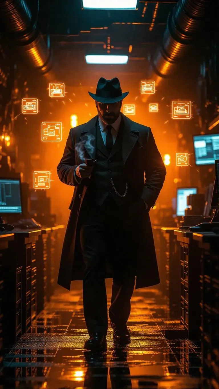 A rugged adult Detective Conan, with a beard and a pipe, investigates a financial fraud syndicate in a dimly-lit, neon-infused office. High-tech clues float on holograms, casting an unusual glow. The office's chaotic, winding design contrasts with Conan's worn, determined expression. Soft, warm yellow and orange lights highlight the technology, while hard, cool shadows emphasize his intense focus and the tension of the scene. The style is a blend of noir and steampunk, capturing both the gritty realism and the mechanical aspects.