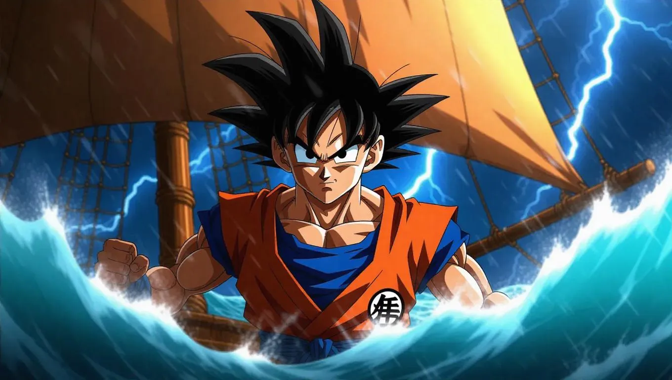 Goku, clad in a pirate outfit, sails on a ship through a stormy sea. His eyes are determined, and his expression shows excitement, ready for adventure. The crashing waves and lightning create a thrilling atmosphere, with the ship rocking against the elements. The light is dark and tumultuous, enhancing the peril of the journey. The scene is rendered in an adventurous style, capturing the spirit of exploration and danger.