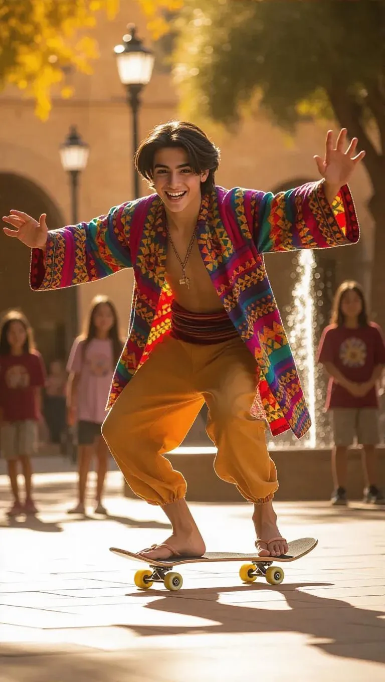 Aladdin, wearing a colorful poncho and flip-flops, performs fun skateboard tricks in a sunny plaza. His playful movements and beaming expressions amuse a group of children. The plaza is decorated with lively fountains and benches, providing a cheerful backdrop. Soft, golden sunlight filters through, casting warm, diffused light that enhances the dynamic action and the delightful spirit of the scene.