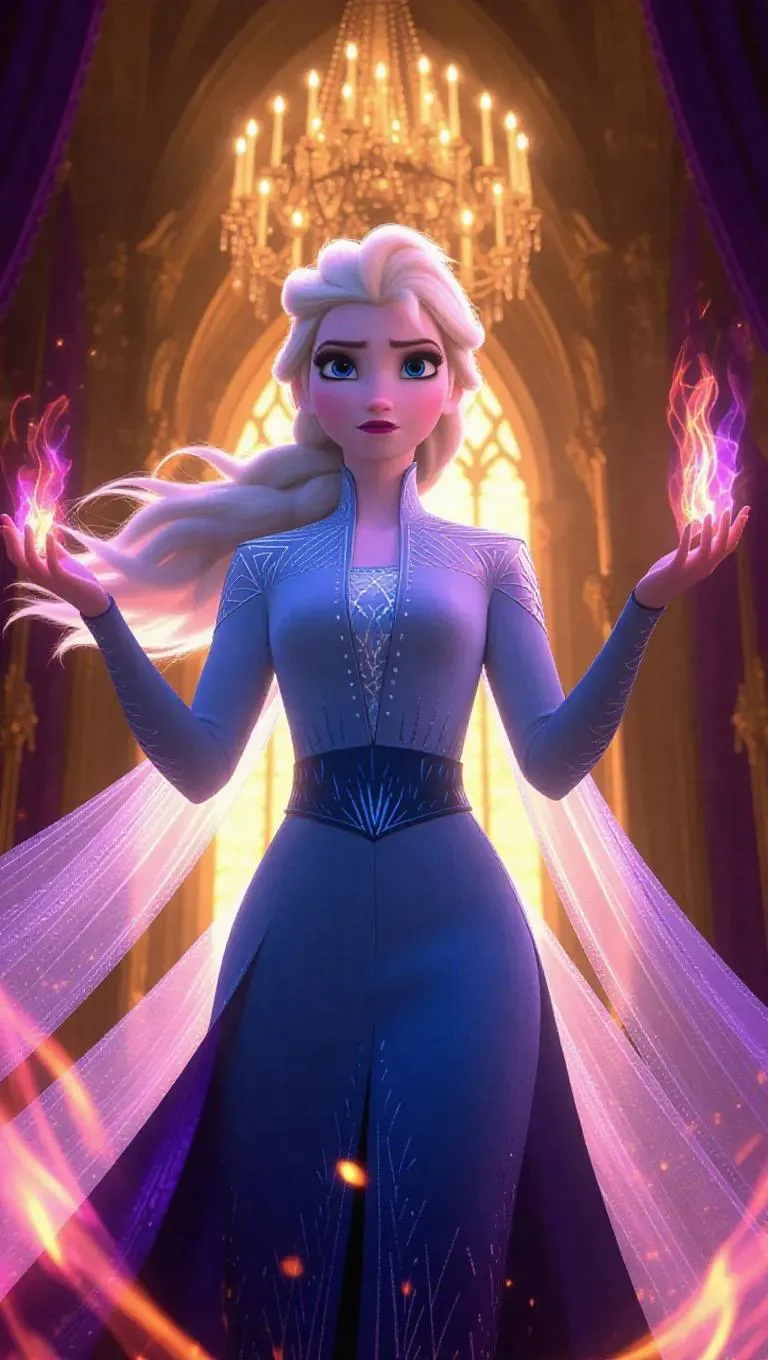 Elsa, with her icy blue hair now entwined with dark purple locks, stands elegantly in a grand castle hall. She wears a regal, silver gown with jeweled accents, her arms outstretched as she calls forth swirling flames. Ornate chandeliers and velvet curtains surround her, enhancing the luxurious, opulent atmosphere. The sky is a striking gold, with magical sparkles in the air. Front light highlights her noble grace, while side light emphasizes the flickering energy of the flames. The style is a fusion of classic beauty and nostalgia, showcasing the elegance of a royal mage.