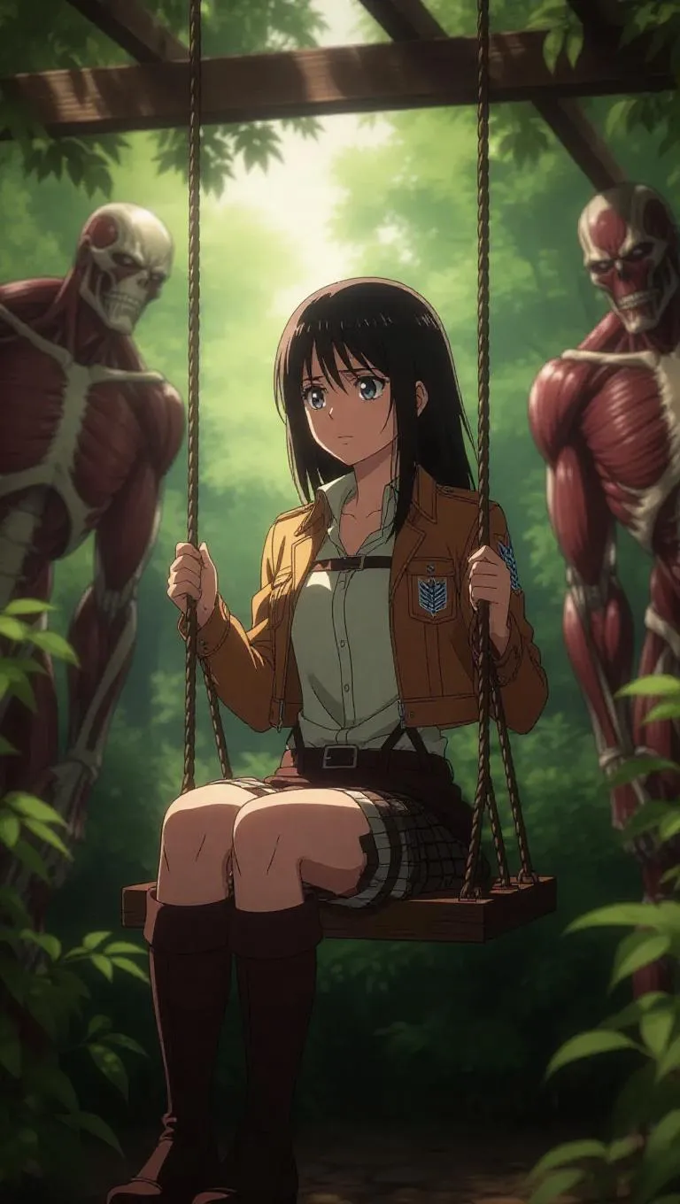Mikasa from *Attack on Titan* sits on a swing in a Victorian garden, lost in thought. She wears a comfortable, casual outfit, her dark hair loosely gathered. Titans linger in the distance, observing her like gentle giants. Soft sunlight filters through the leaves, creating a serene atmosphere. The garden is delightful and lush, filled with happy colors. The lighting is soft and calming, enhancing the peaceful solitude shared between Mikasa and the titans.