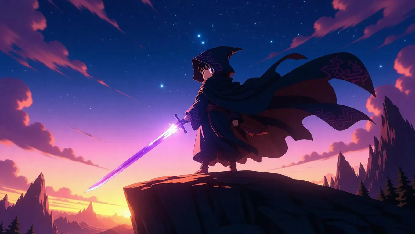 Shin Chan, transformed into a mysterious sorcerer, stands valiantly on a rugged cliff. He wears flowing robes adorned with runes and a hooded cloak, his determined expression illuminated by the glow of his enchanted sword. The magical sky above is filled with bright stars, bathed in soft, warm light that casts gentle shadows and highlights. The scene is rendered in a high-fantasy style, with vibrant colors and meticulous detail, capturing the ethereal beauty of the moment.