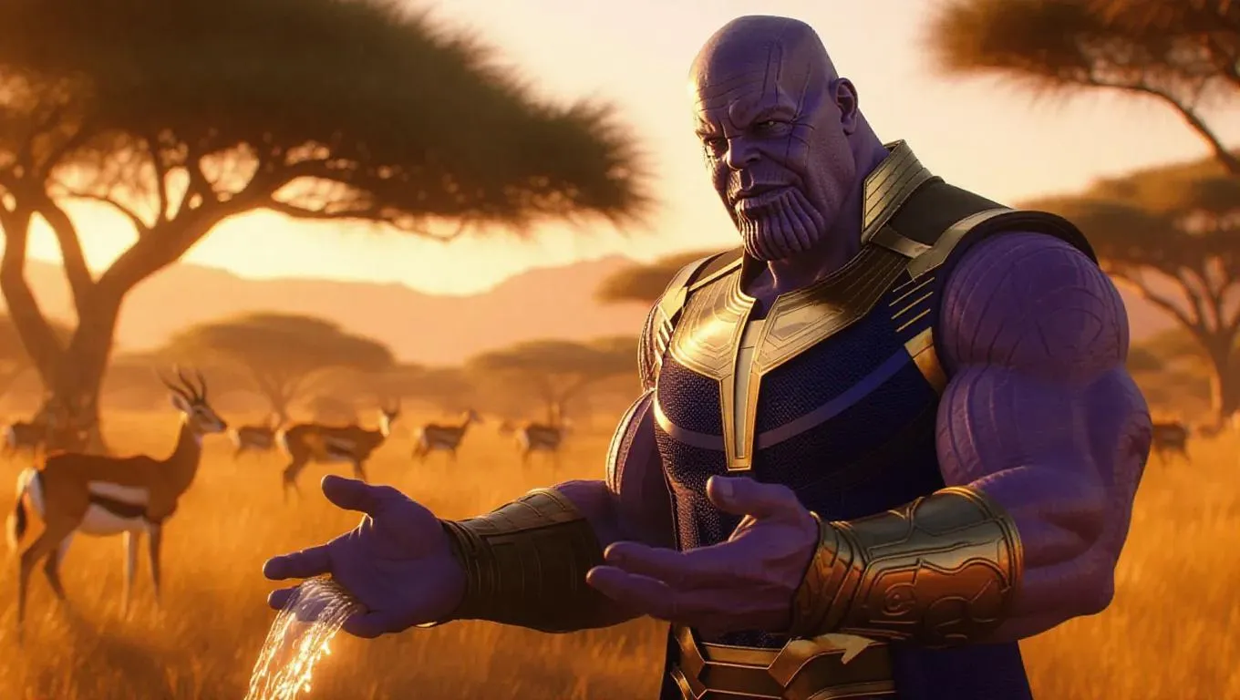 Thanos, dressed in an elaborate tribal outfit, cultivates a wild savanna landscape dotted with acacia trees. He waters hardy grasses, his large hands demonstrating gentle care for the earth. Gazelles graze nearby, painting a lively picture of nature's harmony. The savanna glows under bright, midday sunlight, creating a vibrant atmosphere. The scene is alive with energy, contrasting Thanos's usual ferocity with a nurturing connection to nature.