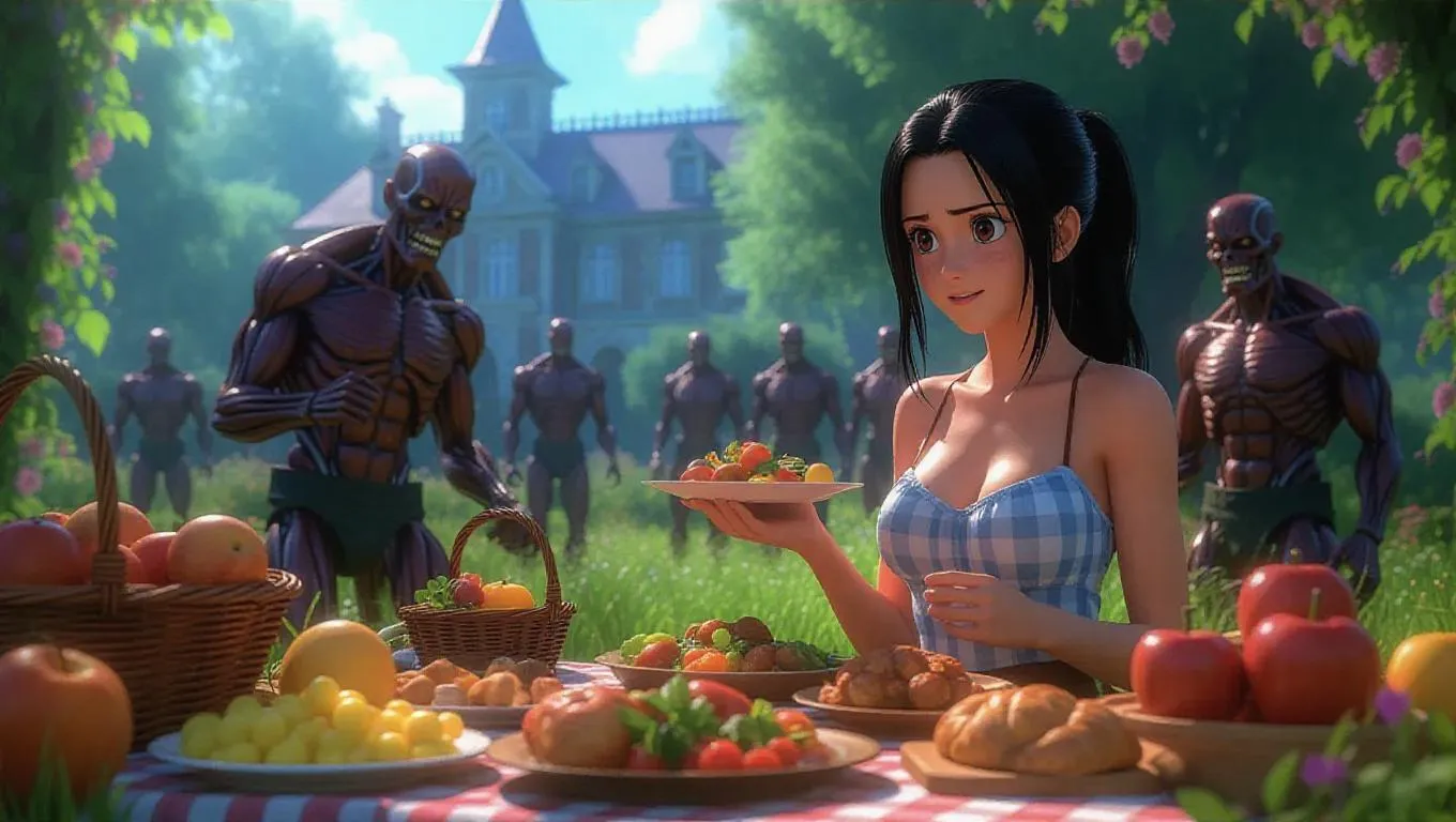 Mikasa from *Attack on Titan* enjoys a picnic in a Victorian garden, surrounded by an array of delicious foods. She wears a casual summer outfit, her dark hair styled in a ponytail. Titans roam in the background, appearing benign and curious. Bright sunlight bathes the scene, illuminating the vibrant picnic spread. The garden is cheerful and vibrant, bursting with life. The lighting is bright and cheerful, emphasizing the joyful atmosphere shared between Mikasa and the titans.