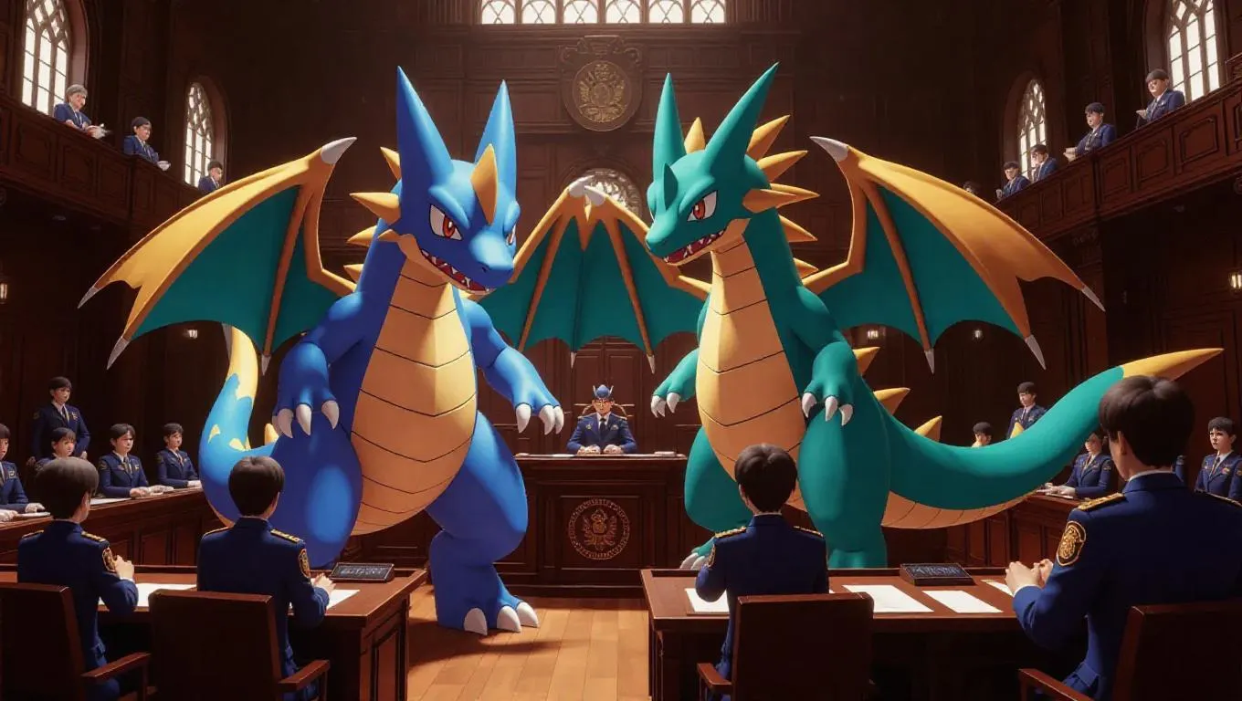In a vast courtroom, Garchomp stands accused of war crimes, dressed in a military uniform. Ash, his loyal lawyer, stands confidently by his side, while Clara, the prosecutor, glares with fierce determination. The surreal and absurd atmosphere is heightened by the presence of various Pokémon witnesses and a judge presiding over the proceedings. Bright, harsh lighting casts strong shadows, emphasizing the gravity of the situation while adding a touch of whimsy. The scene is rendered in an epic adventure style, blending the mundane with the fantastical.