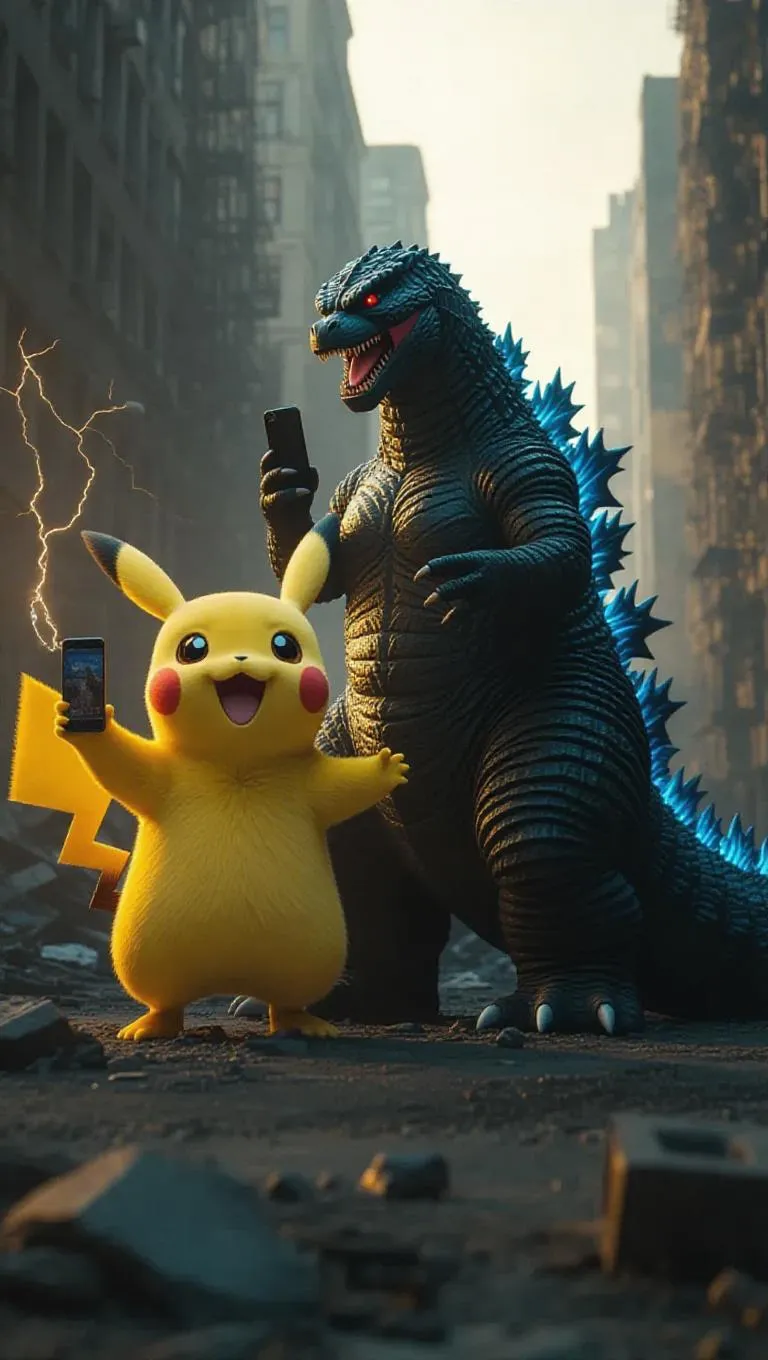 In a photorealistic 8K quality scene, Pikachu and Godzilla stand side by side, grinning as they take a selfie with their smartphones. Godzilla’s back glows with a pale blue aura, while Pikachu is surrounded by crackling lightning. The comical juxtaposition is set against a backdrop of a dusty gray, devastated city, remnants of Godzilla’s destructive path. Soft, warm light from the setting sun casts long shadows, adding a surreal, almost whimsical touch to the urban ruin.