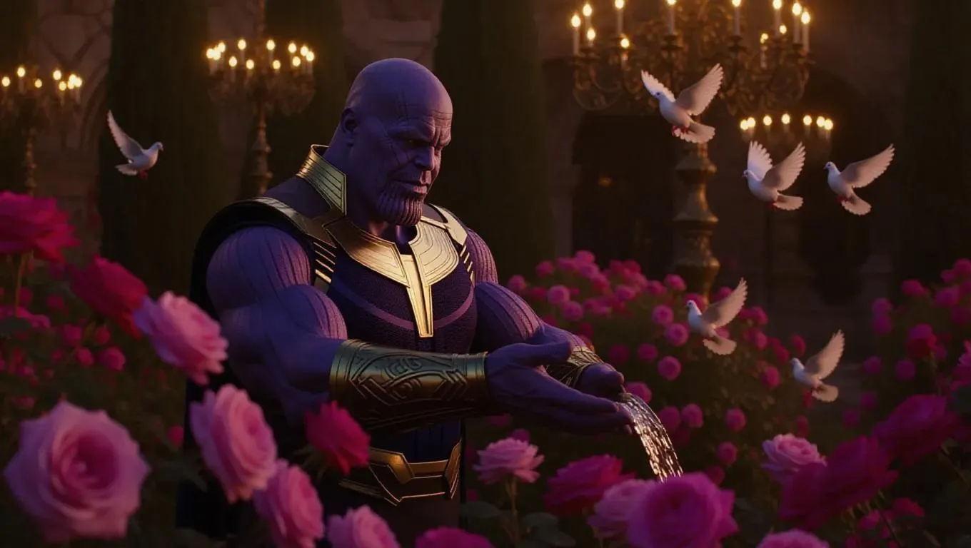 Thanos, in an ornate, flowing robe, tends to an impressive castle garden filled with royal roses. He waters exquisite blossoms, his hands showcasing a gentler side. Doves coo nearby, enhancing the peaceful setting. The garden is bathed in enchanting twilight, casting a spellbinding glow. The scene is fairy-tale-like, contrasting Thanos's usual fearfulness with romance and beauty.
