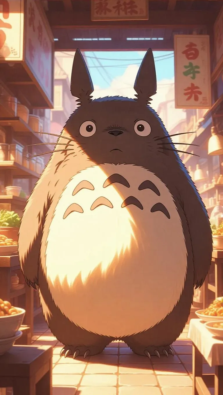 Totoro stands tall amidst a bustling food market, his large, furry body dwarfing the stalls. Delicious scents waft around him, casting warm shadows, while colorful dishes attract hungry customers, bathing the scene in rich earthy tones. Totoro's eyes sparkle with excitement, his whiskers twitching as he observes the culinary delights. Warm, ambient light highlights his gentle expression, creating a joyous blend of nature and gastronomy. The style combines realistic and vibrant art, emphasizing the lively yet delectable atmosphere.