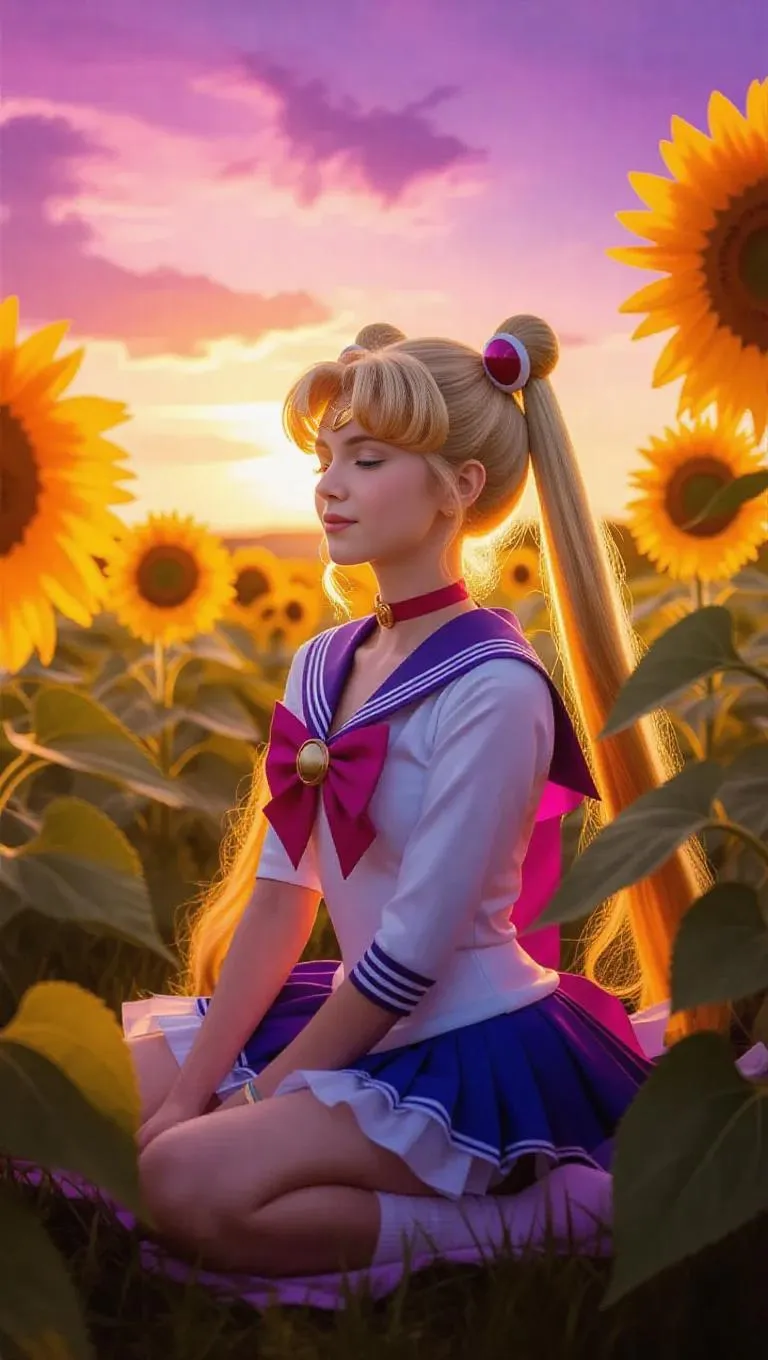 Sailor Moon, dressed in a trendy bohemian outfit with flowy fabrics, enjoys a peaceful moment in a sunflower field during sunset. The vibrant yellows contrast beautifully with the soft purples and oranges of the sky. The scene exudes happiness and tranquility as she takes in the beauty around her. Style: Realistic with a touch of manga influence.