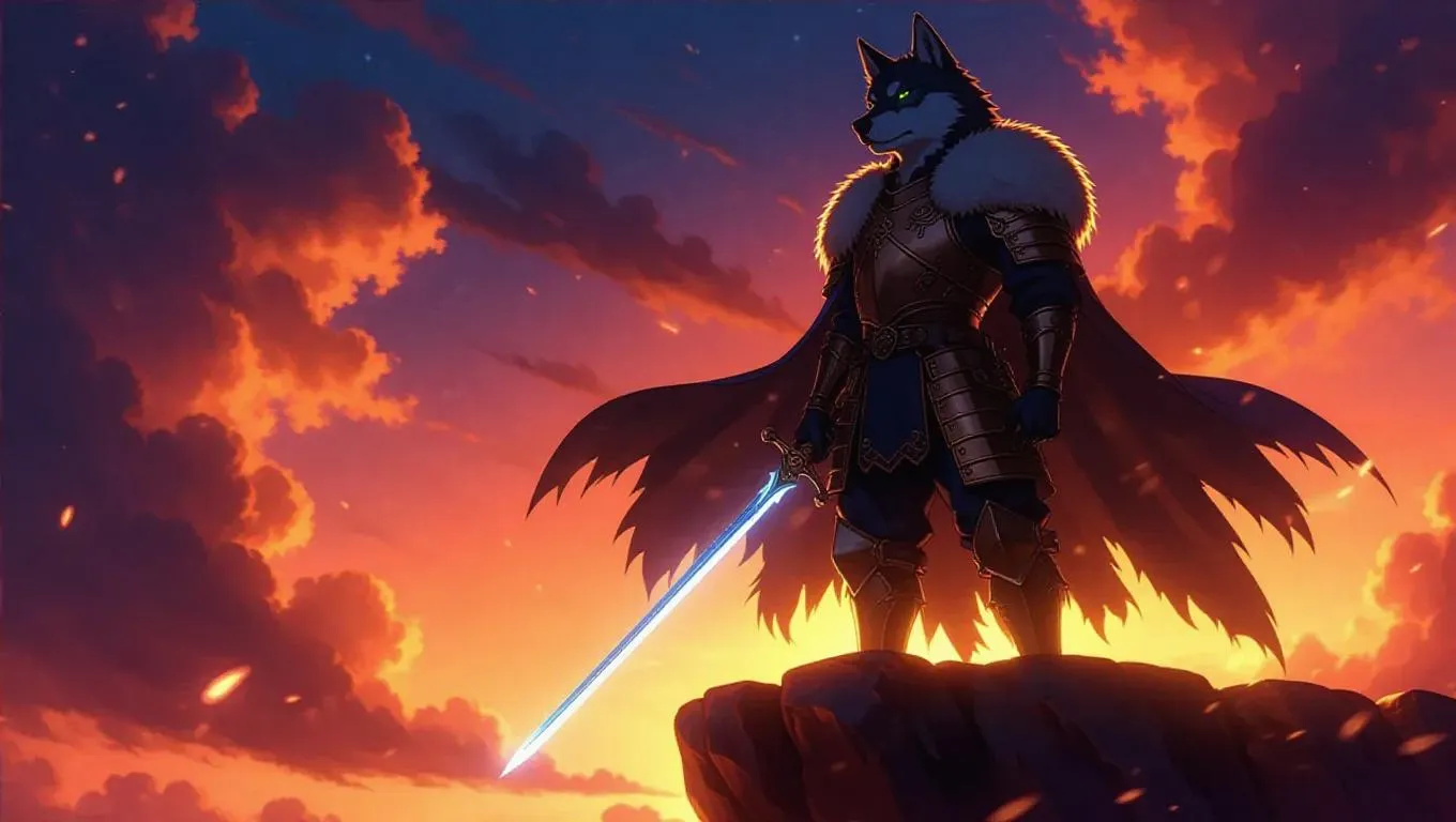 Shin Chan, transformed into a noble wolf lord, stands valiantly on a rugged cliff. He wears fur-trimmed armor and a dark cloak, his determined expression illuminated by the glow of his enchanted sword. The magical sky above is filled with howling winds, bathed in soft, warm light that casts gentle shadows and highlights. The scene is rendered in a high-fantasy style, with vibrant colors and meticulous detail, capturing the ethereal beauty of the moment.