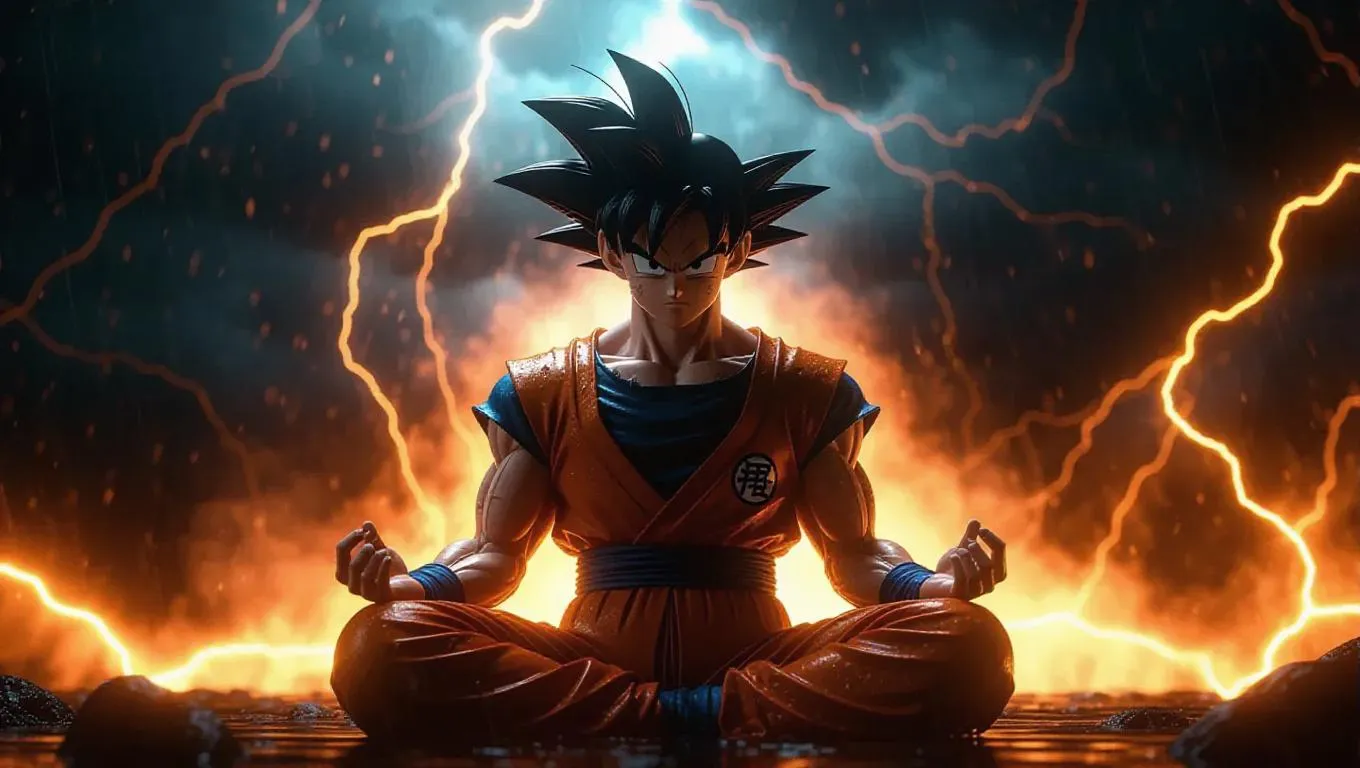 Goku meditates alone in a stormy weather setting, his hair slicked back from rain. His soaked clothing clings to him as electric Dragon Balls flash around him. Intense lighting from lightning strikes creates sharp contrasts, merging with dark clouds, producing a dramatic and tempestuous atmosphere.