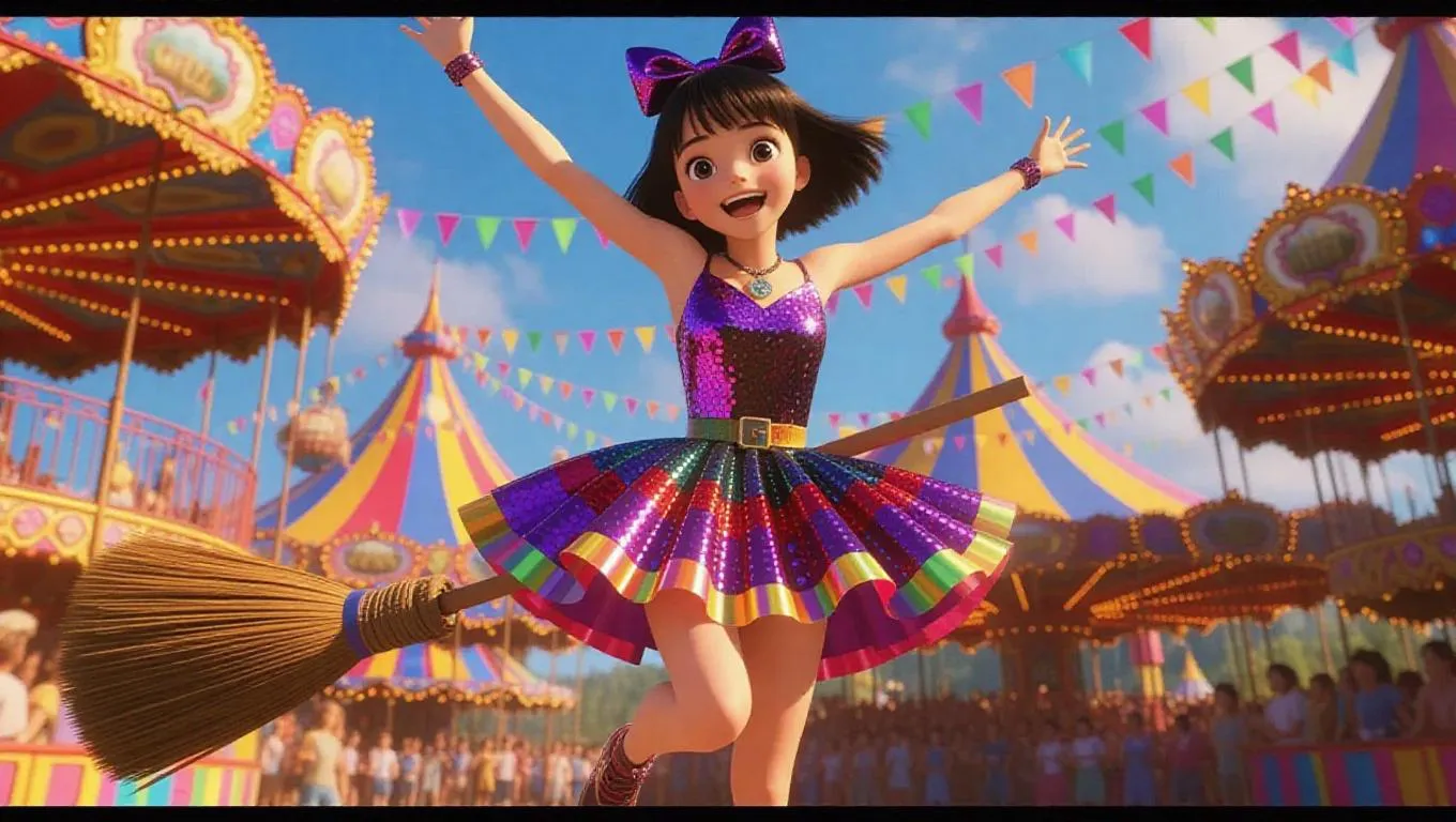 Kiki, the playful courier from *Kiki’s Delivery Service*, dances through a colorful carnival on a jet-powered broom. Her wardrobe shifts to a vibrant, festive costume complete with sequins, reflecting the joyous occasion. The carnival is lively and colorful, filled with rides and crowds. The lighting is bright and cheerful, filled with an array of colors creating a jubilant atmosphere. The scene is set in the afternoon, with laughter and music filling the air.