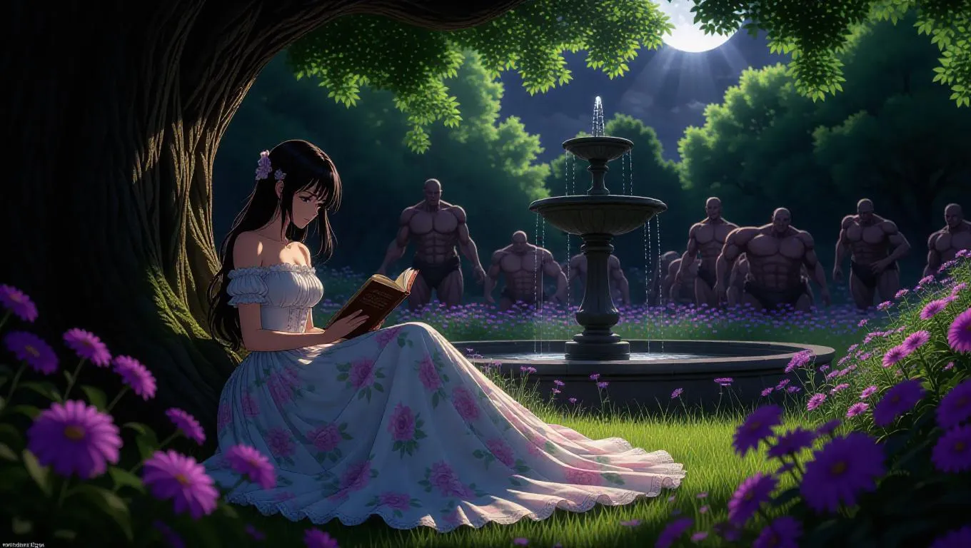 Mikasa from *Attack on Titan* sits in a Victorian garden, reading a book under the shade of an ancient oak tree. She wears a flowing floral dress, her dark hair styled in loose waves. Titans wander slowly among the wildflowers, resembling gentle giants. Silver moonlight casts shimmering reflections on the fountain, creating a magical glow throughout the scene. The garden is overgrown and wild, with vibrant colors and buzzing insects. The atmospheric lighting is ethereal and enchanting, highlighting the dreamlike quality of the juxtaposition between Mikasa and the titans.