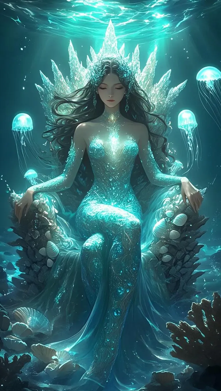 Create mystic underwater scenes with our AI art generator. Craft a radiant sea goddess with glowing crystal coral elements, bioluminescent jellyfish, and divine character design. Perfect for fantasy visuals, mystic atmosphere effects, and AI-powered creative projects. Explore abyss-inspired artistry and magical ocean themes.