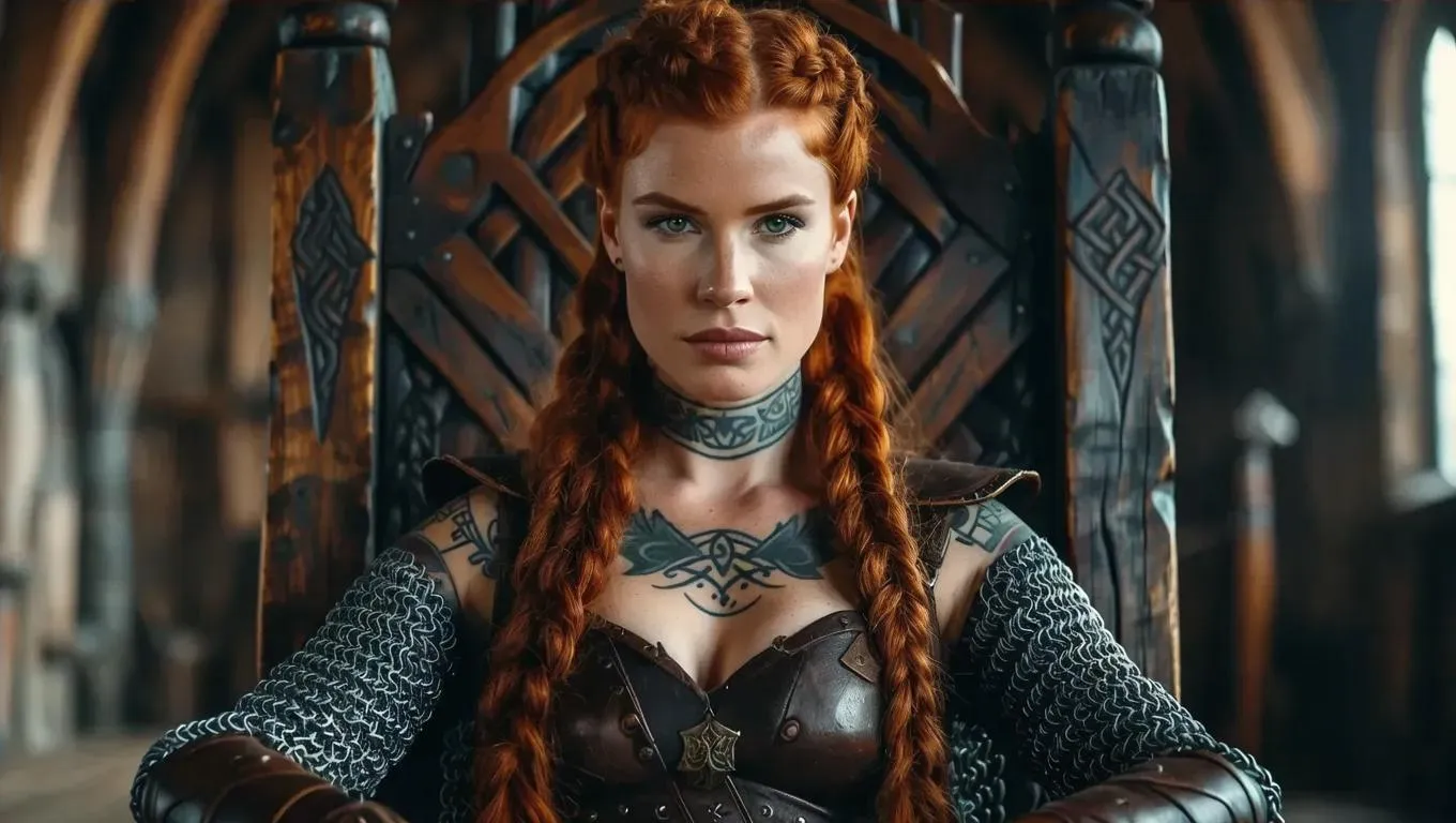 Craft striking AI-generated Viking warrior queen imagery with intricate facial tattoos and braided red hair. Generate powerful visuals of a regal warrior seated on a wooden throne in a medieval great hall. Create professional-grade AI art blending Norse mythology and warrior aesthetics. Transform text into vivid Nordic-inspired visuals using advanced AI effects and editing tools.