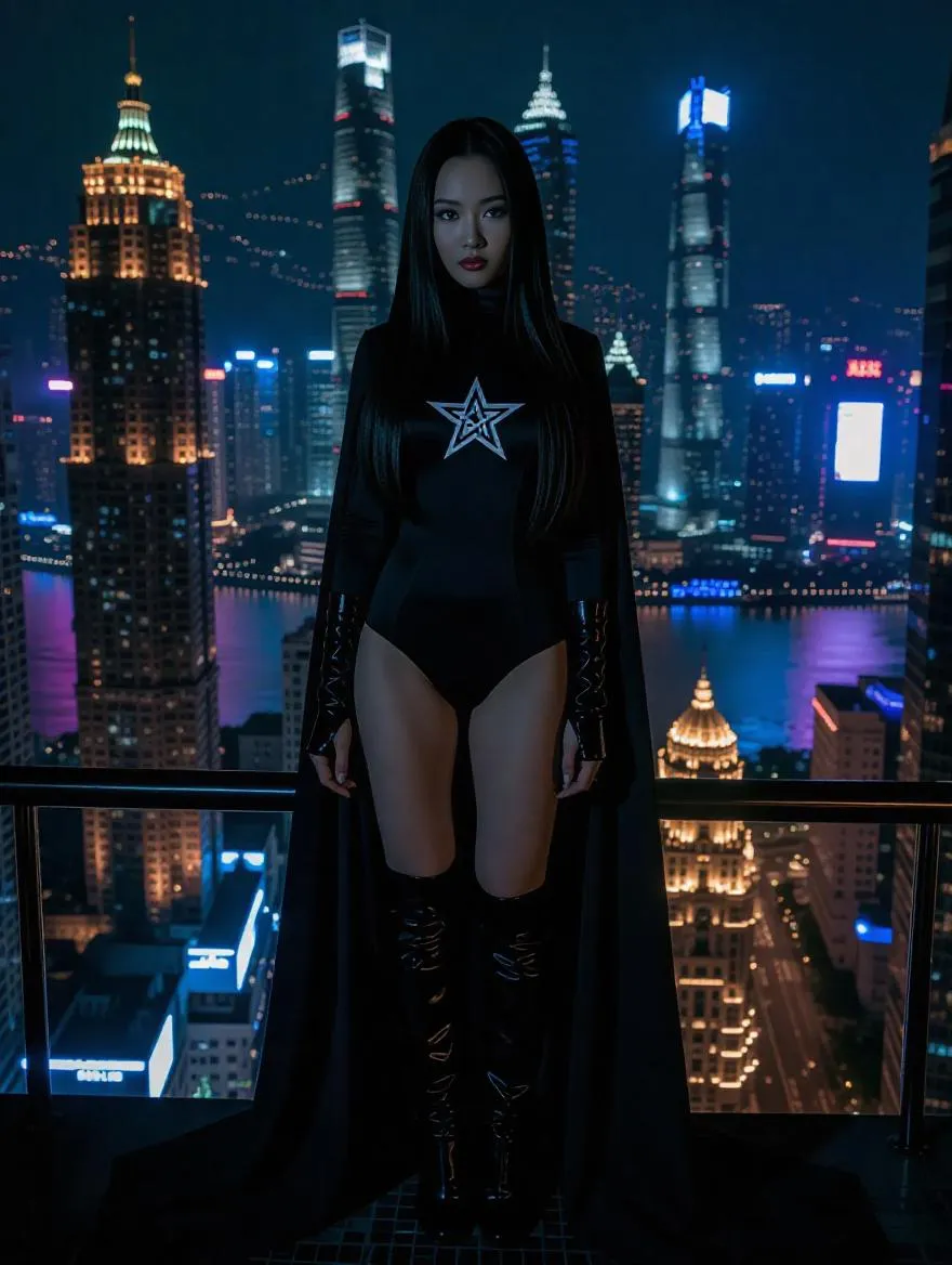 Generate striking AI art of a futuristic Chongqing cityscape with neon-lit skyscrapers, featuring a powerful Chinese woman in a dark bodysuit and flowing cloak. Her glowing dark star emblem, authoritative stance, and high boots contrast the vibrant 360-degree panorama. Perfect for sci-fi visuals, character design, and dynamic AI-generated urban storytelling.