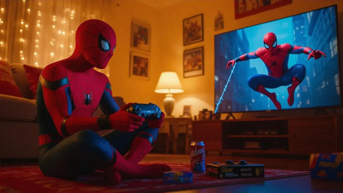 Spider-Man, sitting on the floor in a cozy, dimly lit living room, holds a game controller, fully engrossed in a Spider-Man video game on a large flat-screen TV. The TV displays another Spider-Man swinging through the city, reflecting on his red and blue mask. Scattered around are snacks, a soda can, and game boxes. His posture is focused, slightly leaning forward. The scene captures the meta humor, with detailed, cinematic vibes, realistic lighting, and warm tones. Aspect ratio 16:9.