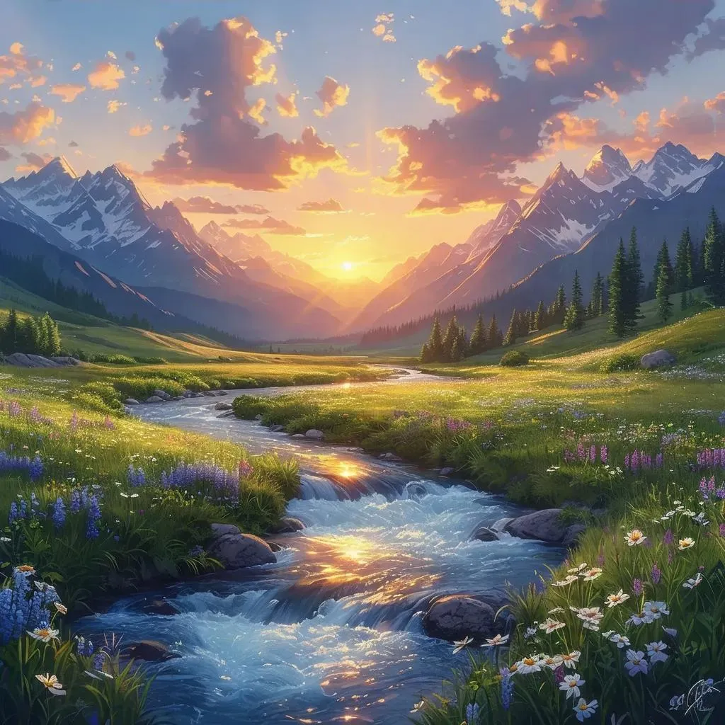 Create a serene mountain valley sunset with a flowing river, snow-capped peaks, and warm golden hues. AI-generated wildflowers bloom along the banks, glowing in the soft evening light for a peaceful, picturesque nature scene. Craft stunning landscapes effortlessly with vivago.ai's advanced AI image tools.
