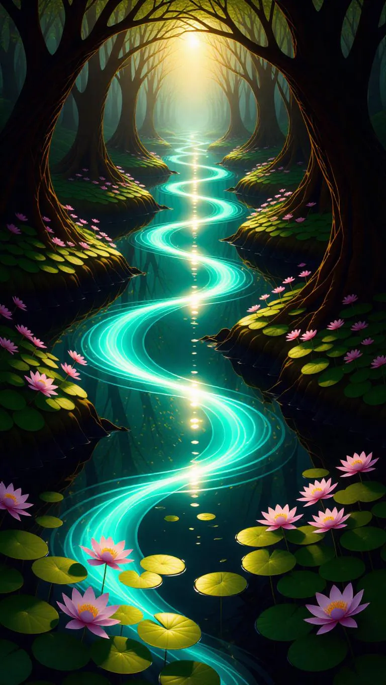 Transform your text into surreal AI art with VivaGo.ai. Generate a mystical river with turquoise waters, petal-swimming currents, glowing mandala-rooted trees, and golden glass palaces. Ideal for fantasy landscapes, digital art, and creative storytelling using AI image generation tools for vibrant, otherworldly visuals.