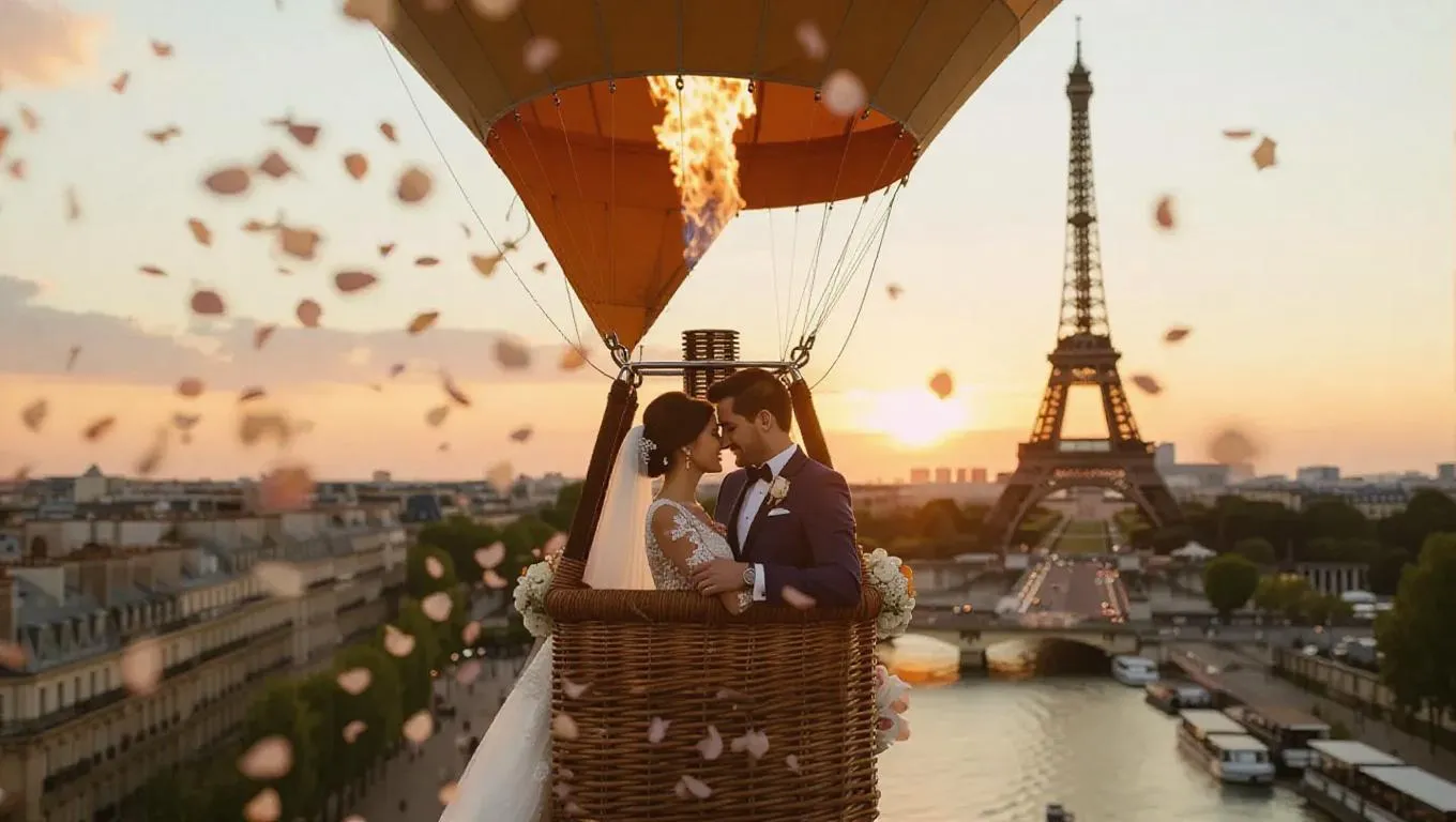 AI-generated romantic Paris sunset scene featuring a newlywed couple in elegant attire embracing in a champagne-gold floral garland-adorned hot air balloon above the Seine. Majestic Eiffel Tower glow, Haussmann rooftops, swirling rose petals, and crystal champagne flutes captured with soft focus and sharp details on platinum wedding bands – perfect for wedding inspiration and AI art.