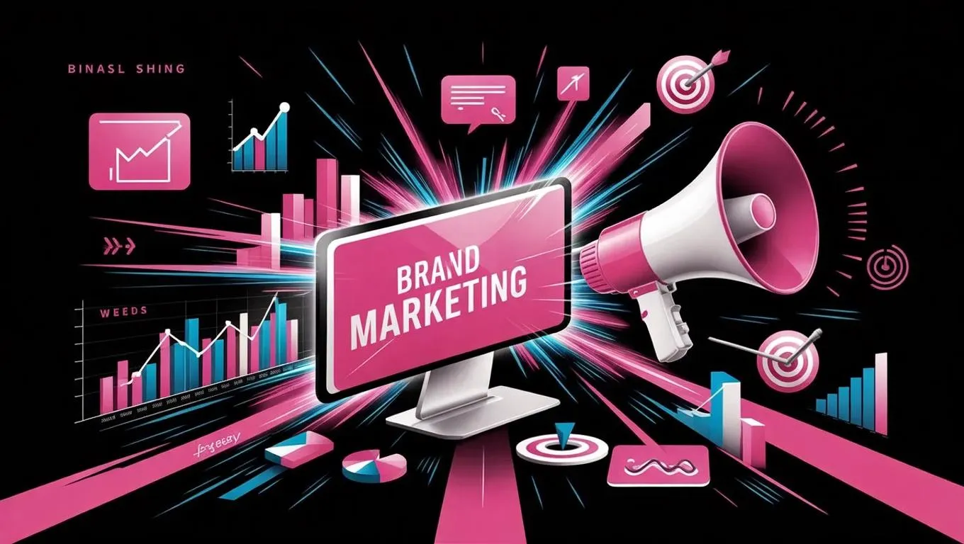 Vibrant digital marketing illustration blending brand strategy & SEO elements—analytics charts, search icons, megaphone, target. Features website optimization, audience growth graphs in sleek minimalist style. Professional Black & Hot Pink palette with subtle tech-textured background. Captures dynamic, forward-thinking approach to modern digital marketing strategies.