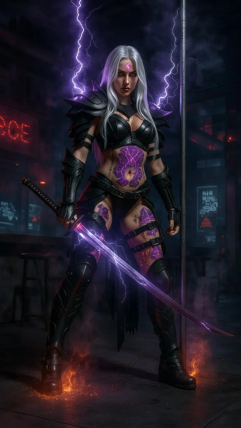 Generate a cyber-gothic warrior queen in a neon-drenched derelict nightclub wielding a glowing obsidian masamune. AI creates her bioluminescent violet hair, Tesla coil pauldrons, plasma-conduit boots, and ritual scarification mirroring constellations. Perfect for edgy sci-fi art, futuristic pole dance visuals, and biomechanical character design with VivaGo's AI-powered creative tools.