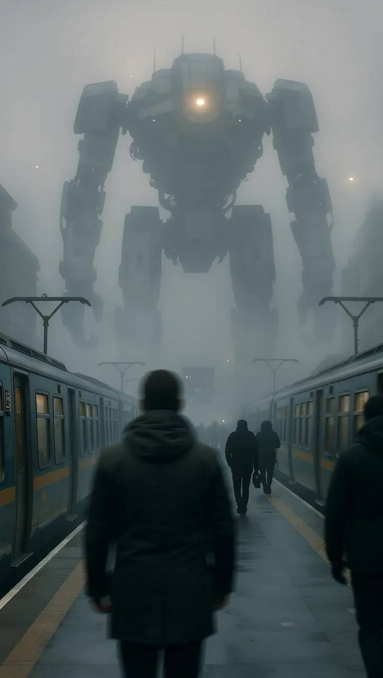 Create this immersive AI-generated scene: blurred man forefront, colossal robotic entity in misty background performing eerie surveillance. Everyday metro life flows on, unaware. Cinematic handheld effect adds raw tension. Generate surreal visuals with Vivago.ai's powerful AI image generator and editing tools for professional results.