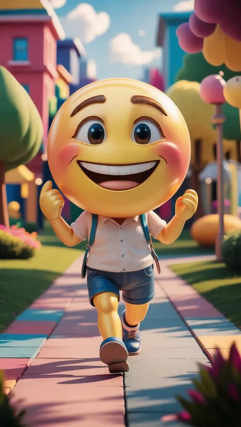 Create a charming 3D smiling face emoji with playful legs and arms strolling through a vibrant park or cityscape. Enjoy smooth animations, cheerful expressions, and vibrant 8K resolution details, crafted by AI for lively, professional-grade visuals.