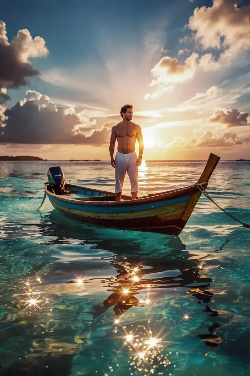 Capture serene ocean sunsets with a man on a boat in turquoise waters, golden hues reflecting sunset sparkles. Tranquil, dreamy atmosphere evokes calm. Create professional-grade AI-generated visuals with VivaGo AI’s advanced image tools.