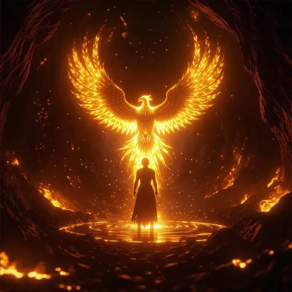 Ignite your creativity with this AI-generated cinematic scene of fiery rebirth. A molten-gold energy Phoenix emerges from volcanic flames, symbolizing transformation. Detailed volcanic caverns, swirling embers, and glowing reflections capture fantastical artistry. Perfect for fantasy visuals, cinematic storytelling, and symbolic AI-powered imagery blending fantasy, fire elements, and rebirth themes in vivid, warm-hued detail.