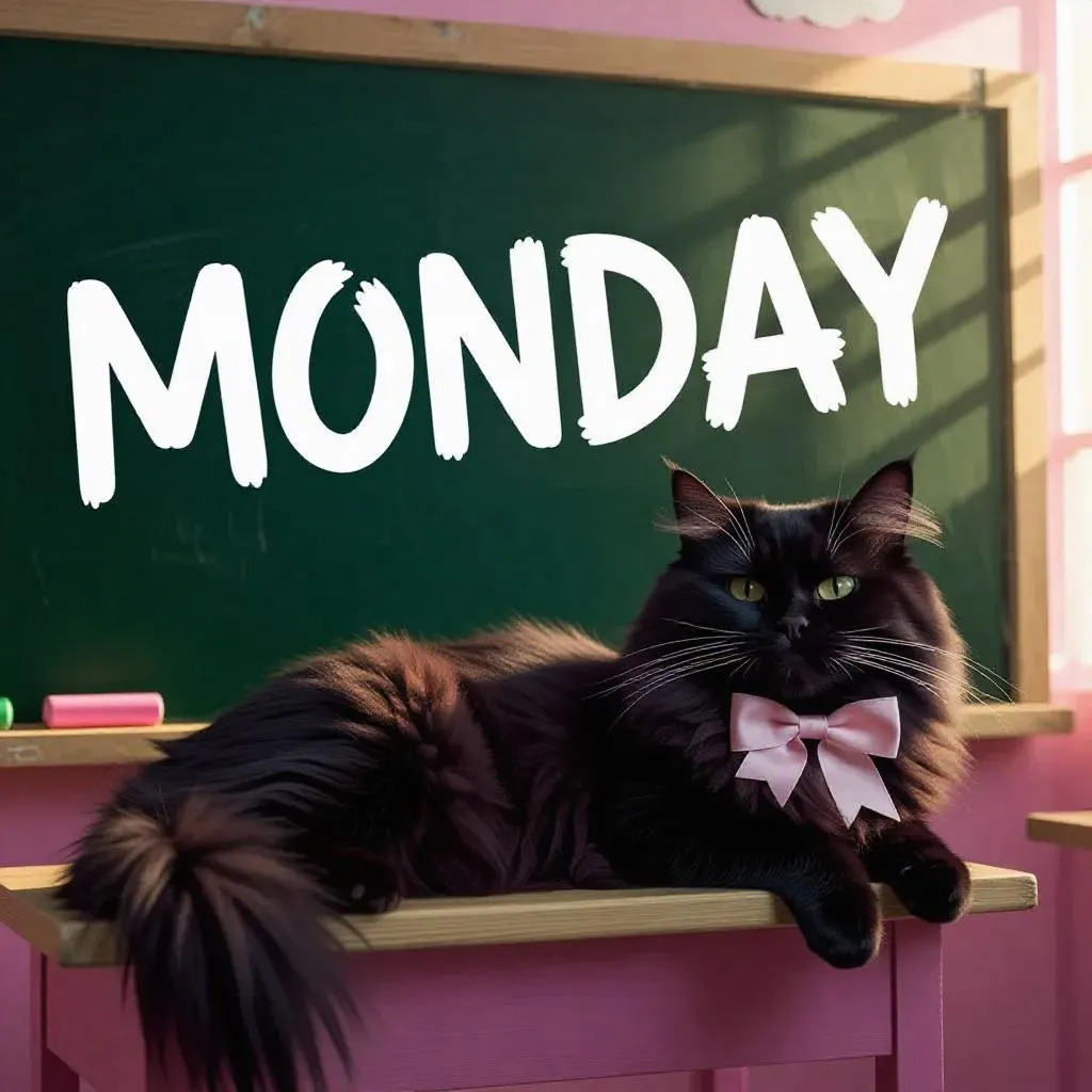 Generate a whimsical Monday classroom scene with AI: playful chalkboard, fluffy black cat wearing pink bow, and soft pastel lighting. Perfect for creative visuals, greeting cards, or social media content. Explore vivago.ai's AI tools for enchanting, professional-grade imagery effortlessly.